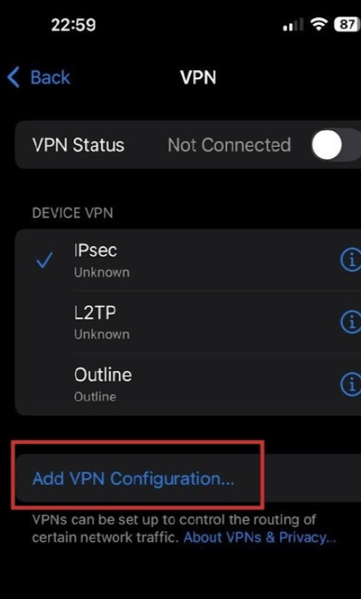 2. Open on iPhone Settings -> General -> VPN & Device management -> VPN -> Add VPN Configuration.