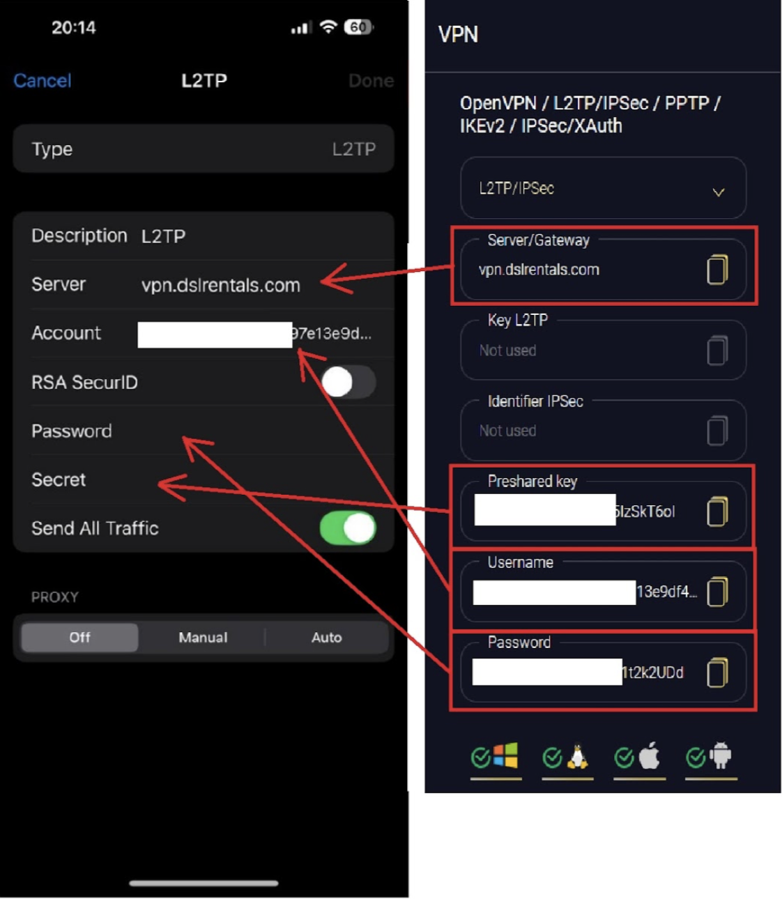 vpnrentals.com and login with the access key, select the VPN connection protocol: L2TP/IPsec.