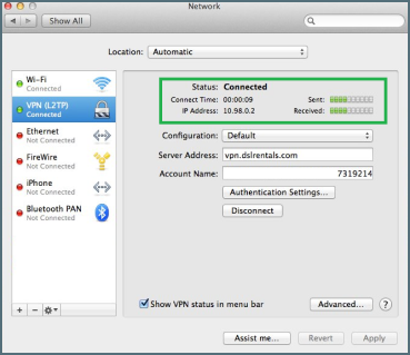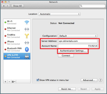 4. Server Address: vpn.dslrentals.com, Account Name: login from panel, Authentication Settings -> Password: password from panel, Press button Connect.