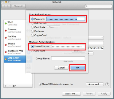 3. Copy Server / Gateway, Username, and Password data from the panel and paste it into the new VPN connection form on your Mac. You can find it by System Preferences -> Network -> Press “+”.